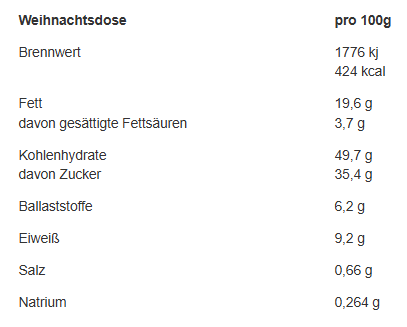 Ölsamen (Mandeln, Haselnüsse, Walnüsse), Zucker, Wasser, Weizenmehl, Glukose-Fruktose-Sirup, Orangenschalen, Feigenpaste, Feuchthaltemittel: Glycerin, Sorbit; Vollei, Kakaomasse, Gewürze, Zimt, Zitronenschalen, Butterreinfett, Honig, Aprikosenpüree, Kartoffelstärke, Hühnertrockeneieiweiß, Weizengrieß, Backtriebmittel: Natriumcarbonate; Kakaobutter, Invertzuckersirup, Dextrose, Säuerungsmittel: Citronensäure; Säureregulator: Kaliumcitrate; Salz, Emulgator: Lecithine; Glukosesirup, Vollmilchpulver, Geliermittel: Pektine; Erbsenprotein, Reismehl, Verdickungsmittel: Gummi arabicum; natürliches Aroma.