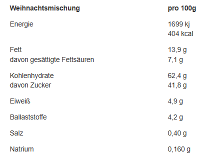 | Brennwert | 1699 kJ / 404 kcal |