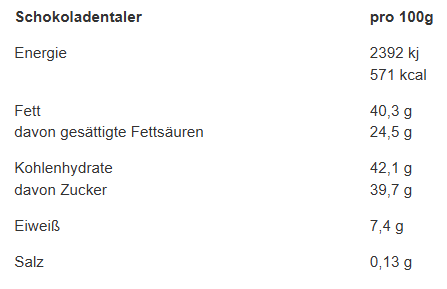 Zutaten: Zucker, Kakaomasse, Kakaobutter, Vollmilchpulver, natürliches Vanille-Aroma, Emulgator: Lecithine (enthält Soja).