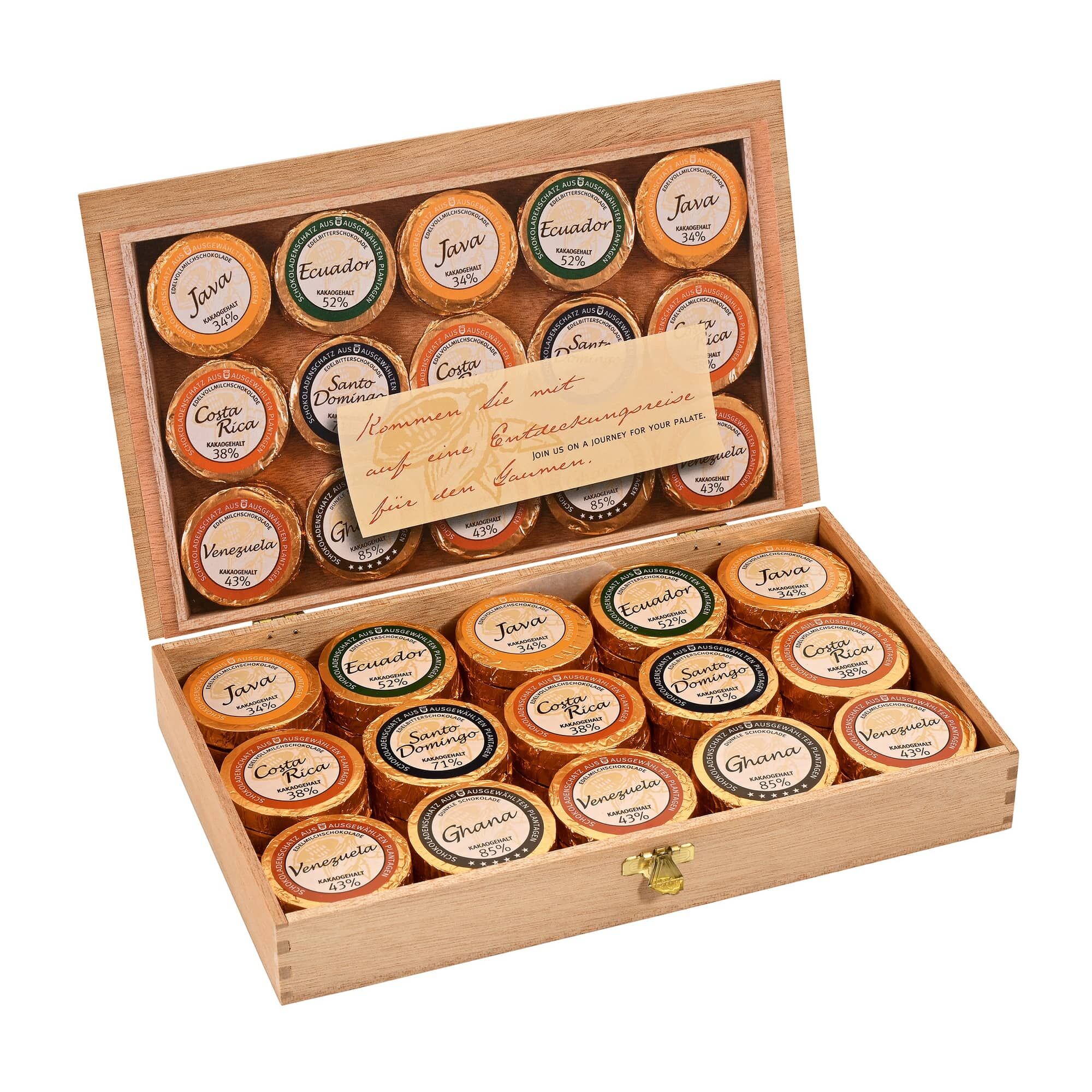 Die edlen Schokoladen werden in einer stilvollen Holzbox präsentiert. Für jede Sorte werden Kakaobohnen aus verschiedenen Regionen benutzt. Dadurch wird jedes Stück zu einer besonderen Spezialität und bekommt ein ganz individuelles Aroma. Ob cremige Vollmilchschokolade oder Zartbitterschokolade, mit einem Kakaoanteil von 34% bis 85% findet jeder Schokoladen-Liebhaber seinen Favoriten. Nach dem Genießen der Schokotaler kannst du die Holzbox wunderbar wiederverwenden, zum Beispiel als dekorative Geschenkverpackung in der Winterzeit.