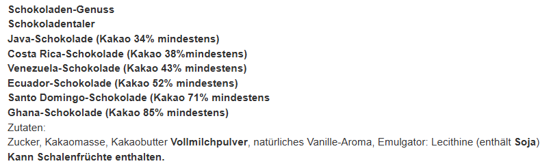 Java-Schokolade (Kakao: mindestens 34%); Costa Rica-Schokolade (Kakao: mindestens 38%); Venezuela-Schokolade (Kakao: mindestens 43%); Ecuador-Schokolade (Kakao: mindestens 52%); Santo Domingo-Schokolade (Kakao: mindestens 71%); Ghana-Schokolade (Kakao: mindestens 85%)