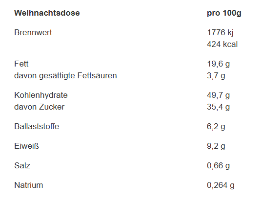 Zutaten: Ölsamen (Mandeln, Haselnüsse, Walnüsse), Zucker, Wasser, Weizenmehl, Glukose-Fruktose-Sirup, Orangenschalen, Feigenpaste, Feuchthaltemittel: Glycerin, Sorbit; Vollei, Kakaomasse, Gewürze, Zimt, Zitronenschalen, Butterreinfett, Honig, Aprikosenpüree, Kartoffelstärke, Hühnertrockeneieiweiß, Weizengrieß, Backtriebmittel: Natriumcarbonate; Kakaobutter, Invertzuckersirup, Dextrose, Säuerungsmittel: Citronensäure; Säureregulator: Kaliumcitrate; Salz, Emulgator: Lecithine; Glukosesirup, Vollmilchpulver, Geliermittel: Pektine; Erbsenprotein, Reismehl, Verdickungsmittel: Gummi arabicum; natürliches Aroma.